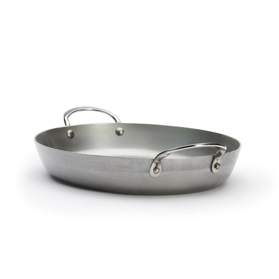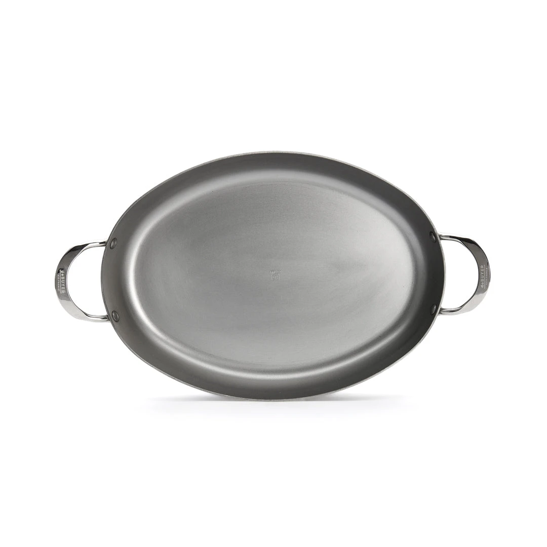 The Mineral B Oval Roasting Pan is made of carbon steel – 99% iron and 1% carbon, the most natural cooking material praised by Chefs around the world. Lighter than cast iron and more heat conductive than stainless steel, this Oval Roasting Pan becomes naturally non-stick after seasoning, without any chemicals or synthetic coating, and gets better the more you use it.Β